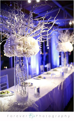Snow flocked trees and a custom chuppuh topped with ivory hydrangea for that really lush soft look. We took a different take on hanging crystals which you will still see a lot this year. We also added some lighting to the backdrop for that extra wow. Lighting is the latest "must have" in wedding design - at least we think so!