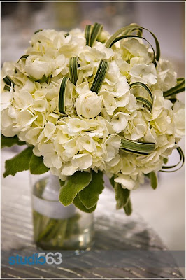This dainty bouquet is filled with hydrangea, white ranuncula accents, varigated grass loops and crowned with lamb's ear. Lamb's ear is soooo soft!