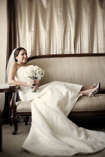 Ahh... the pretty mango calla lilies for the bridesmaids bouquets with the addition of some apidstra leaves. Love!
